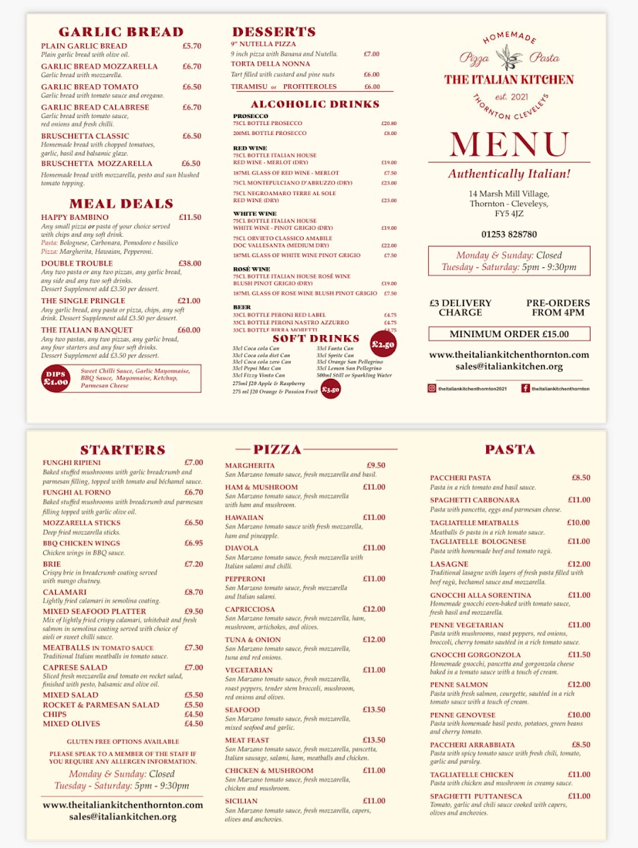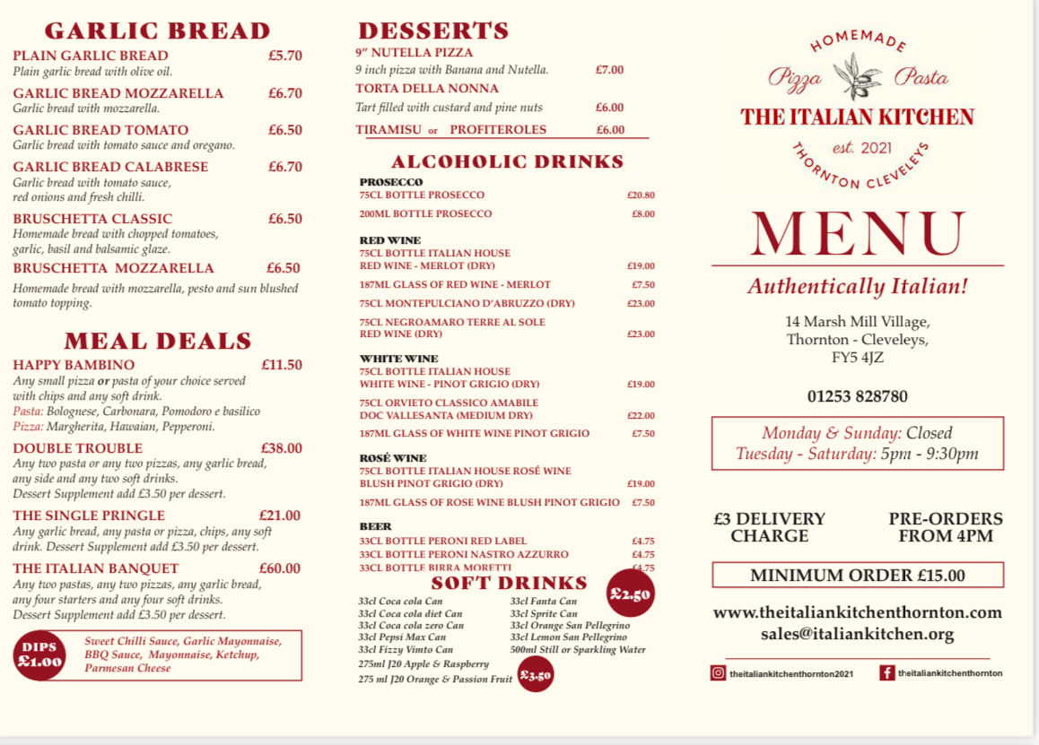 Welcome to The Italian Kitchen, a hidden gem located in Thornton-Cleveleys. Offering a delightful mix of authentic Italian cuisine, this restaurant promises a memorable dining experience. Their menu features an array of tantalizing dishes, from delectable starter options like Funghetti Ripieni and crispy mozzarella sticks to hearty pizzas topped with premium ingredients. The renowned Margherita and spicy Diavola pizzas showcase the restaurant's commitment to quality and flavor.