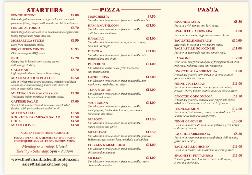 Desserts are also a highlight, with the indulgent 9" Nutella Pizza and classic Tiramisu providing perfect endings to your meal. With positive reviews praising the exceptional service and value for money, visitors like Josie Davis and Philip Knagg only reinforce the restaurant's reputation for serving some of the best pizzas around. Join us at The Italian Kitchen to savor the essence of Italy, where every dish invites you to indulge in rich flavors and warm hospitality.